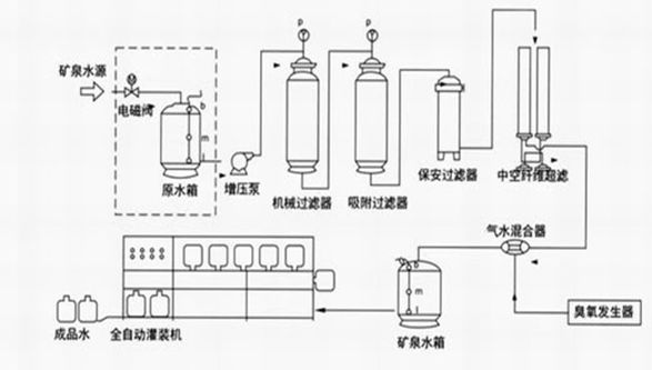一、純凈水/礦泵水工藝流程 礦泉水廠生產工藝流程圖: 純凈水/礦泉水廠生產工藝流程(圖): a) 原水泵 主要功能:恒定系統供水壓力,穩定供水量 。 b) 機械過濾器 采用多次過濾層的過濾器,主要目的是去除原水中含有的錳、鐵重金屬、泥沙、鐵銹、膠體物質、懸浮物等顆粒在20um以上的物質,系統可以進行反沖洗、正沖洗等一系列操作。 主要功能:保證設備的產水量,延長設備的使用壽命。 c) 活性炭過濾器 采用果殼活性炭過濾器,活性炭不但可吸附電解質離子,還可以進行離子交換吸附。經活性炭吸附還可使高錳酸鉀耗氧量(COD)由15mg/L(02)降至2-7mg/L(02),此外由于吸附作用使表面被吸附復制的濃度增加,因而還起到催化作用,去除水中的色素、異味、大量生化有機物、降低水的余鹵值及農藥污染物和除去水中三鹵化物(THM)以及其他的污染物。系統可以進行反沖洗、正沖洗等一系列操作。同時,設備具有自我維護系統,運行費用很低。 主要功能:保證設備的產水質量,延長設備的使用壽命。 d) 軟化系統 為防止濃水端特別是RO裝置最后一根膜組件濃水側出現CACO3,MGCO3,MGSO4,CASO4,BASO4,SRSO4,SISO4的濃度大于其平衡溶解度常數而結晶析出,損壞膜原件的應有特性,在進入反滲透膜組件之前系統采用鈉型陽離子交換樹脂,進行離子交換吸附,去除水中主要硬度成分,吸附飽和后,樹脂失效,可用工業用鹽進行再生樹脂,使之恢復交換能力。 每套軟化系統包括:軟化罐、控制器(或射流器/鹽泵)、鹽箱及鹽閥 主要功能:防止反滲透摸結垢,延長反滲透膜的使用壽命。 e) 精密過濾器 精密過濾器用來截留預處理系統漏過的少量機械雜質。過濾器筒體采用工程塑料或SUS304材質;內裝PPF濾芯。聚丙烯濾芯是一種效率高、阻力小的深層過濾元件。適用于含懸浮雜質較低(濁度小于2-5度)的水進一步凈化。聚丙烯濾芯由聚丙烯纖維按一定規律纏繞在注塑聚丙烯多孔管上形成。主要功能:保證進入反滲透膜的水顆粒度小于0.1um。 f) 反滲透系統 反滲透裝置是用足夠的壓力使溶液中的溶劑(一般是水)通過反滲透膜(或稱半透膜)而分離出來,因為這個過程和自然滲透的方向相反,因此稱為反滲透。 反滲透法能適應各類含鹽量的原水,尤其是在高含鹽量的水處理工程中,能獲得很好的技術經濟效益。反滲透法的脫鹽率提高,回收率高,運行穩定,占地面積小,操作簡便,反滲透設備在除鹽的同時,也將大部分細菌、膠體及大分子量的有機物去除。 h)設備工藝流程圖: 原水→原水增壓泵→多介質過濾器→活性炭過濾器→離子交換器→保安過濾器→多級高壓泵→RO反滲透系統→純水箱→全自動桶/瓶水灌裝生產線→包裝→入庫 一、礦泉水生產工藝流程圖: